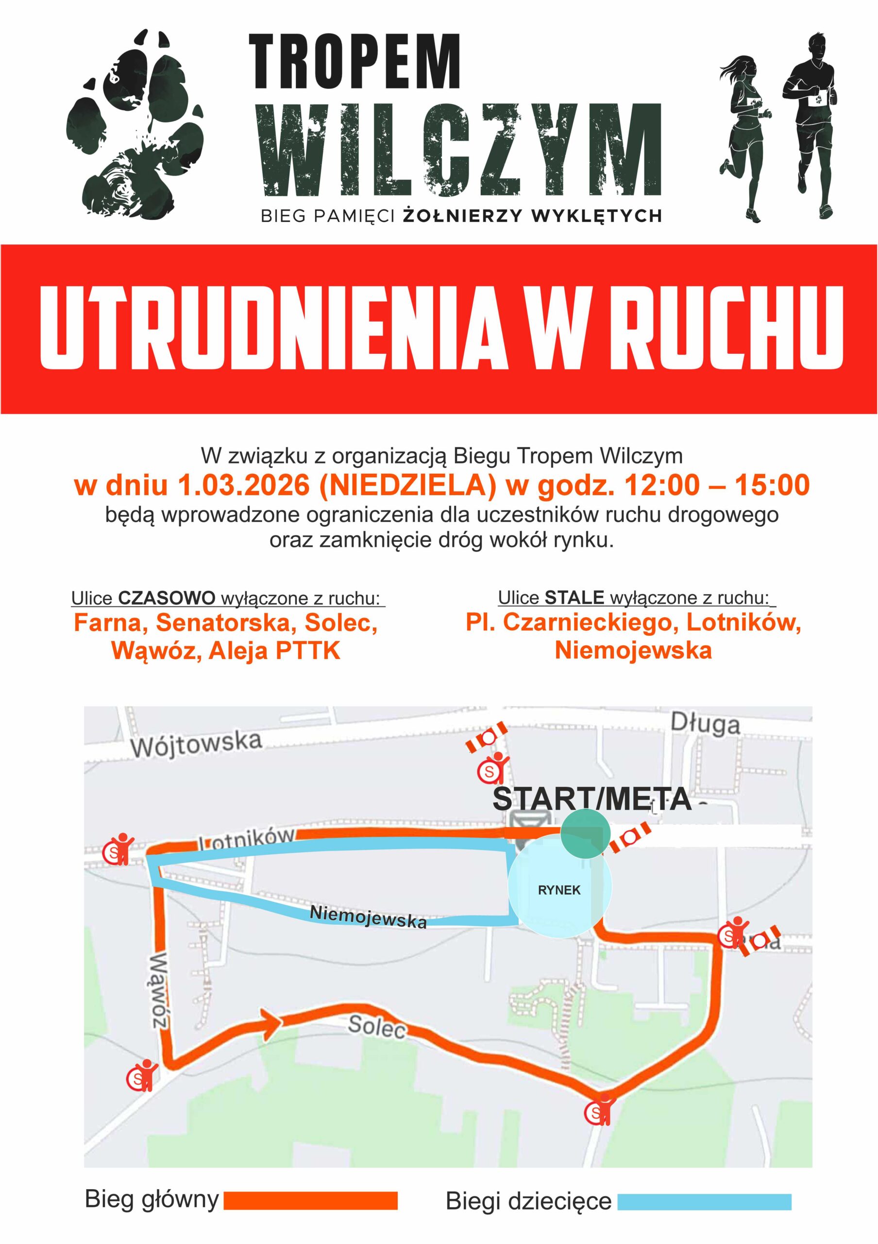 Uprzejmie informujemy, że w związku z organizacją uroczystości i Biegu Tropem Wilczym w dniu 1.03.202. w godzinach 12:00 – 15:00 będą wprowadzone ograniczenia dla uczestników ruchu drogowego oraz zamknięcie dróg wokół rynku.