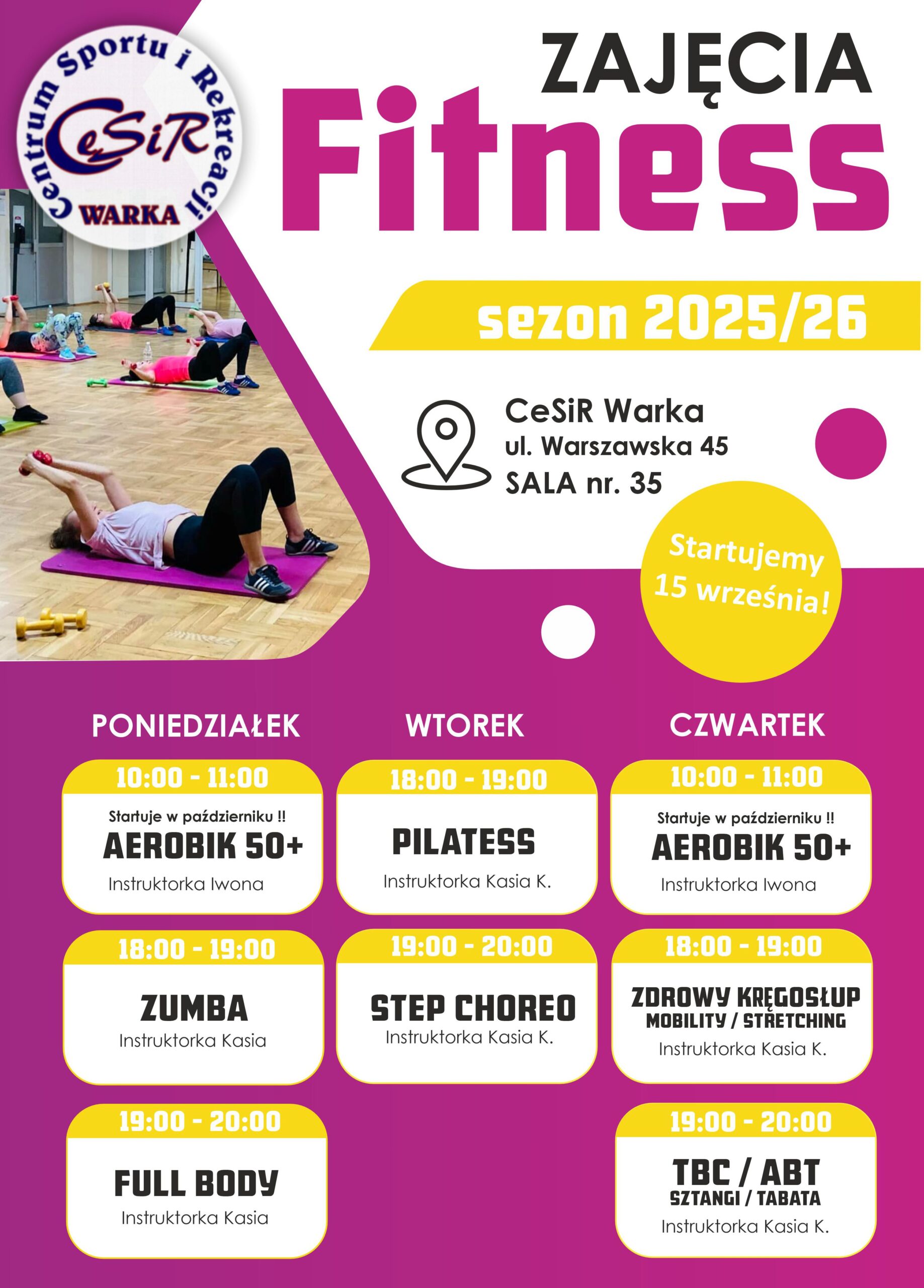 Zumba, Pilates, Step Choreo, Zdrowy Kręgosłup, TBC, Full Body i Aerobik 50+ prowadzone przez nasze Instruktorki Kasię K., Kasię W. i Iwonkę M.